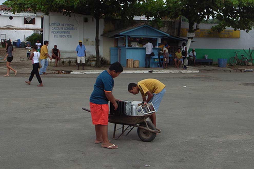 Que voit-on sur ces photos ? D’abord des véhicules sommaires, des caddies à la carriole, transportant toutes sortes de débris trouvés dans les rues ou sortis de poubelles : câbles jetés, ordinateurs laissés dans les rues, téléviseurs abandonnés, vieux cadenas et vélos rouillés… Tout y passe et tout est bon à récupérer. Les véhicules en question révèlent d’ailleurs le caractère quasi anachronique d’une telle activité (tout du moins en décalage avec des formes plus institutionnelles de récupération). Dans sa représentation la plus visible, le ramassage informel de métaux, activité qui apparait miséreuse, ne se fait pas avec des moyens très modernes.