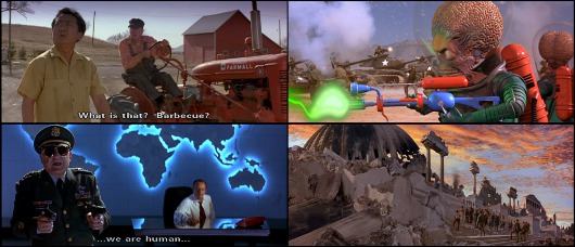 Mars Attack (1996) est, malgré ses clins d'œil parodiques au cinéma des années 1950, le film le plus politique de Tim Burton. Il s'ouvre par une séquence où un redneck raciste demande à son voisin philippin si c'est le nouvel an dans son pays car il sent une odeur épouvantable de viande brûlée. Après une guerre sans merci contre des extraterrestres particulièrement fourbes, l'Amérique sauvera le monde grâce à la chanson "indian love call" de Slim Whitman et pourra se reconstruire en partant de Las Vegas, la cité du divertissement. Jack Nicholson incarne ici un des rares présidents américains du cinéma qui soit à la fois bête et couard.