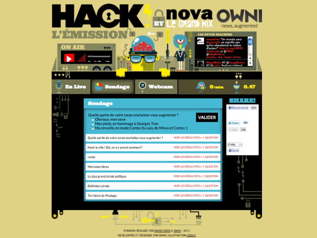 Minuit sonne sous la verrière de Radio Nova… Let’s go Hack IRL ! In-Real-Life ! Le Hacking citoyen, Geoffrey Dorne en a fait son projet de fin d’études à l’ENSAD. Chercheur en design et collaborateur, entre autre, d’Owni.fr avec sa chronique Vendredi c’est graphism, il explique comment le citoyen peut aller “à l’encontre de la surveillance accrue et pouvoir ainsi, recouvrer certaines libertés et certains droits menacés par l’État.” Le contenu de la box ? Découvrez-le sur Graphism.fr !