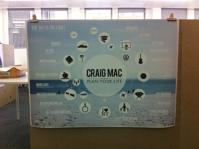 Il a disposé, autour d’un cercle, tant ses projets professionnels (“get a job”, “become a teacher”, “retire”) que sentimentaux (“get married”, “have children”) ou de loisirs (“Japan, life time dream trip”), avec des précisions parfois étranges (“more children, with american accent”). Craig McAnuff précise qu’il s’agit surtout d’un projet étudiant et que, en tant que croyant, “this is just a visual of how I want parts of plan of my life to map out, but it’s all in God’s hands” (“c’est juste une image représentant la manière dont je voudrais que les différents aspects de ma vie se déroulent, mais tout ça est entre les mains de Dieu“). On est rassurés.