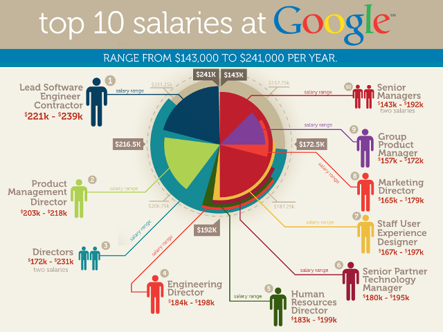 A l’inverse, cette infographie de Job Vine, qui représente le parcours d’embauche chez Google, n’est pas avare en formes et en couleurs… Et pourrait bien vous faire réfléchir à deux fois avant de postuler chez eux, sauf si vous ne regardez que la partie “salaires”…