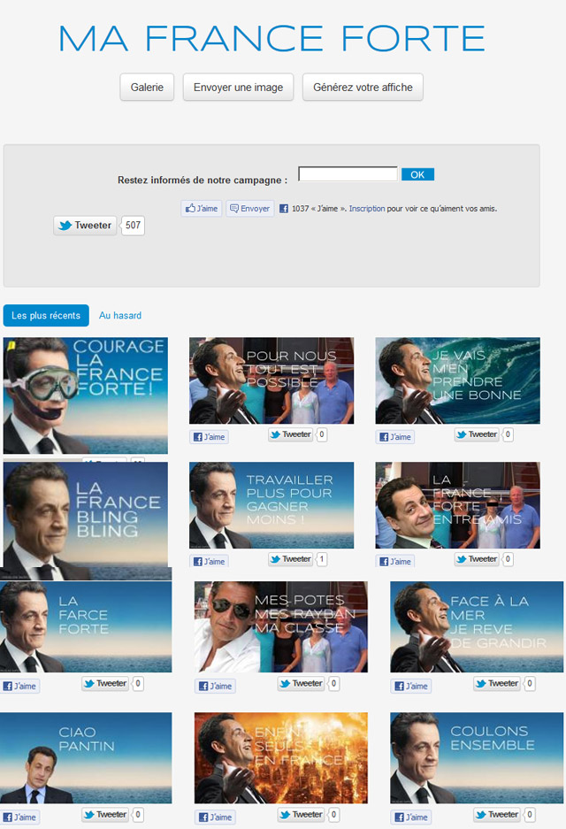 On termine sur un WTF qui continue sur Nicolas Sarkozy et plus précisément avec ce chouette générateur d’affiches de campagne. Intitulée, “Ma France Forte”, ce site créé par les Jeunes socialistes va vous permettre de choisir l’image du candidat Sarkozy, le texte et le fond pour générer… une nouvelle affiche de campagne !