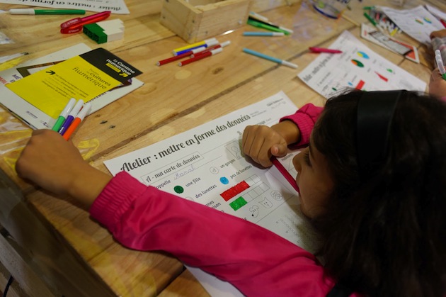 Notre mission : sensibiliser des écoliers à l’art de récolter les données et de les mettre en forme de différentes façons : diagramme circulaire, colonnes… Dans ma tête, ce n’est pas gagné d’avance. Comment intéresser des enfants à un concept aussi abstrait (et, accessoirement, paraître aussi cools que le stand d’à-côté, dédié aux imprimantes 3D et aux robots) ?